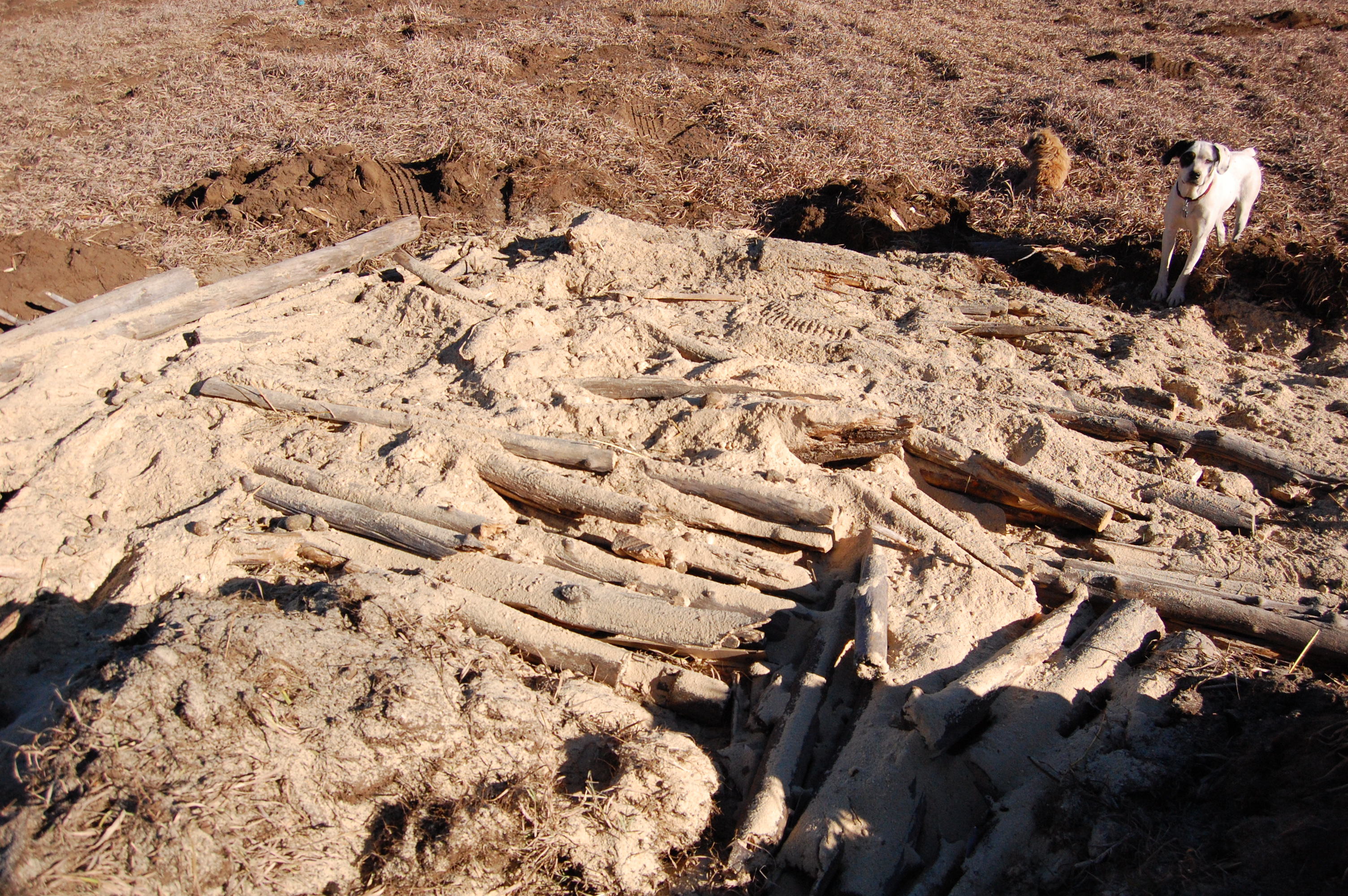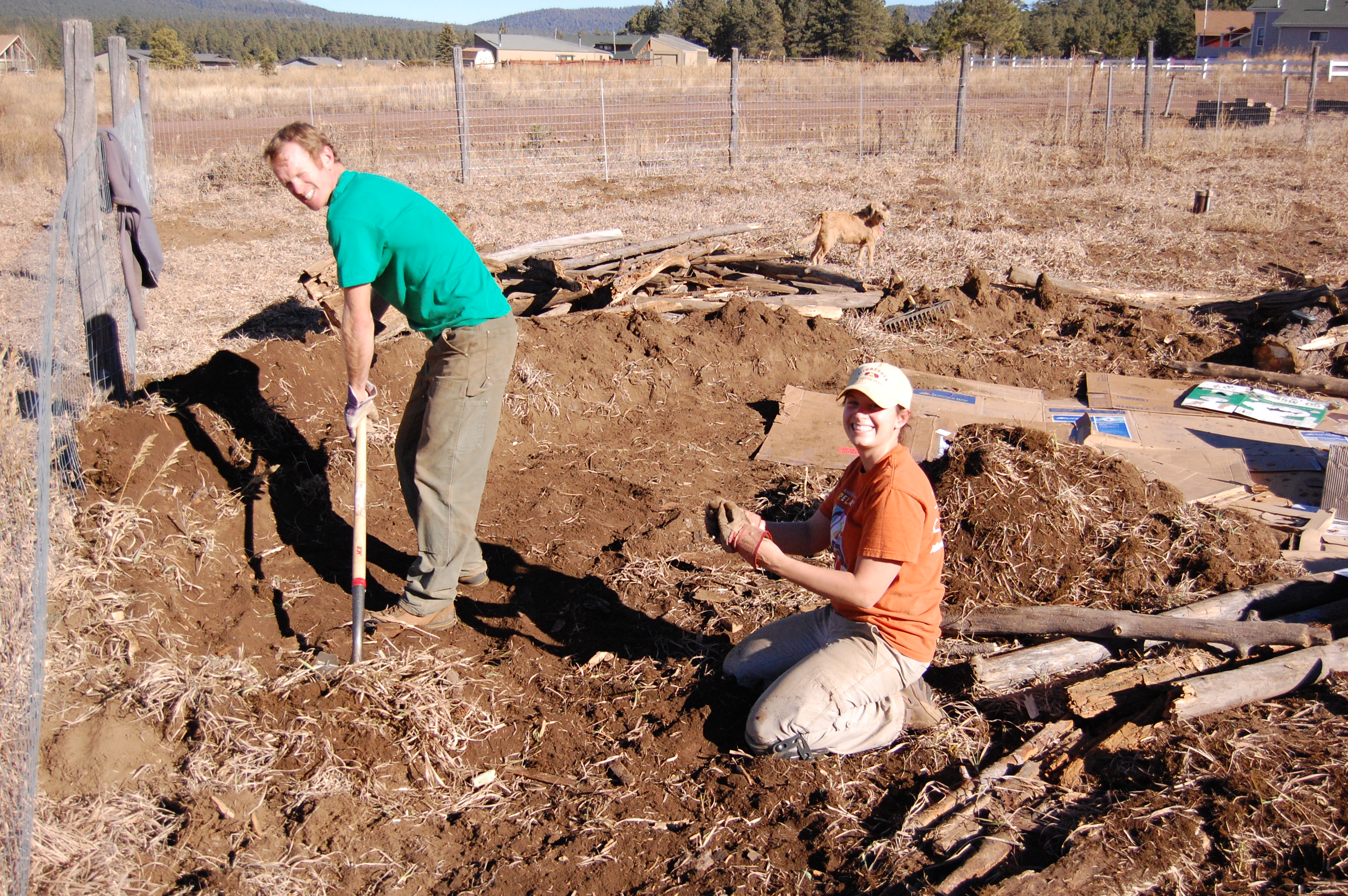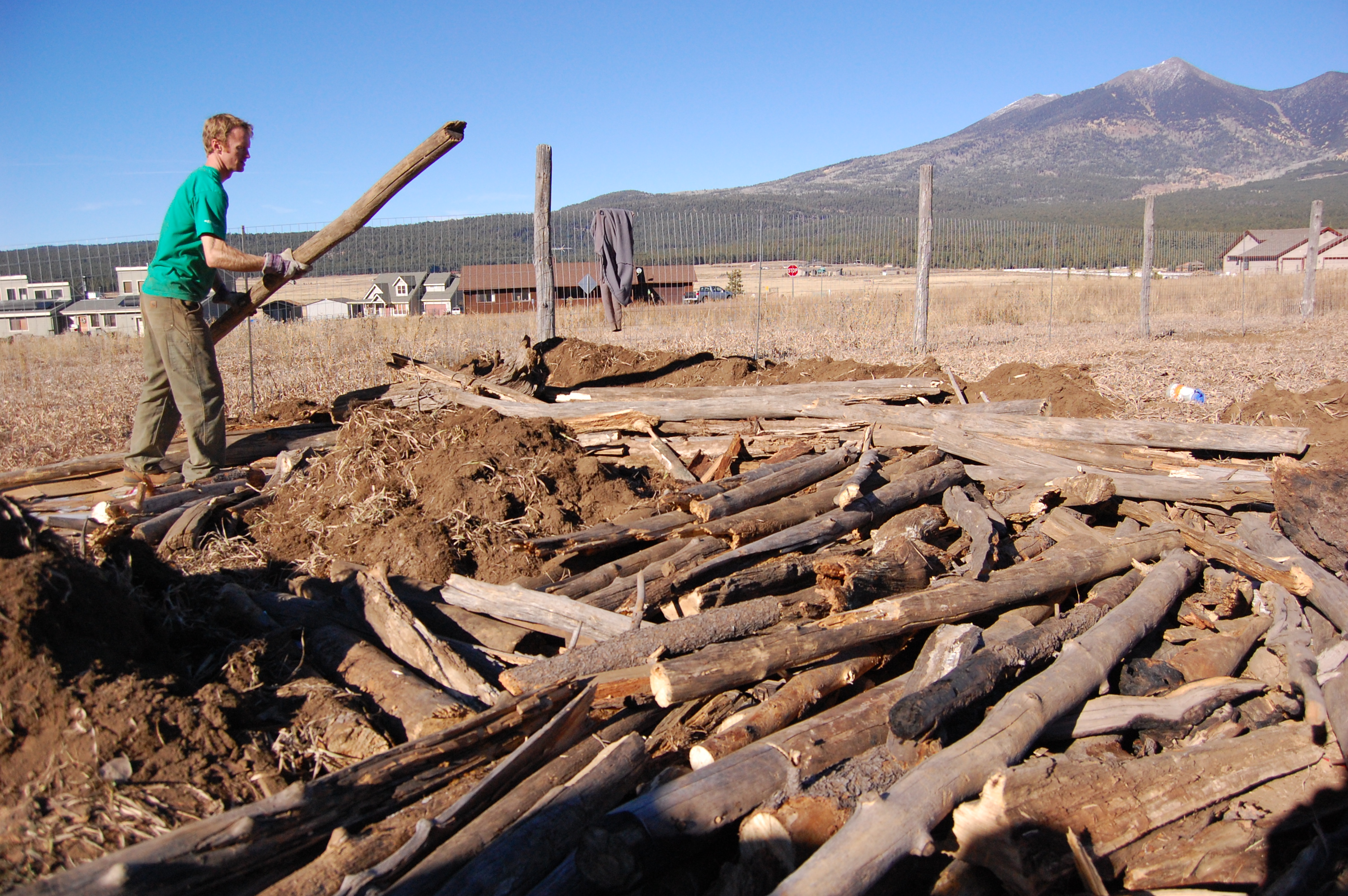 We also just finished installing our first hugelkultur bed, a permaculture method that Kara and Ben planned and designed for the EcoRanch. We dug down about a foot, put down a bunch of cardboard, then laid down old logs and sticks, covered them with sawdust, leaves, and woodchips. Next we spread a thick layer of soil and then another layer of woodchips. The idea is that the wood will absorb and slow the water flowing down the hill while breaking down, supplying nutrients to the soil and creating a small microclimate from the heat released from the decay of the wood and possibly extending the growing season. We plan on putting in one more before the snow comes and then two in the spring. Check out the photos below.