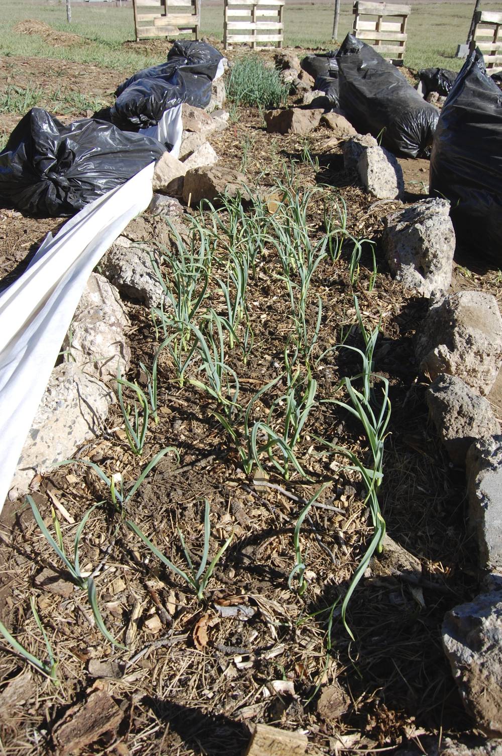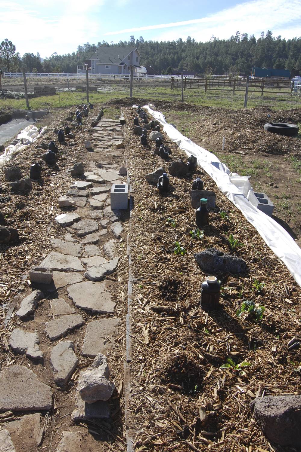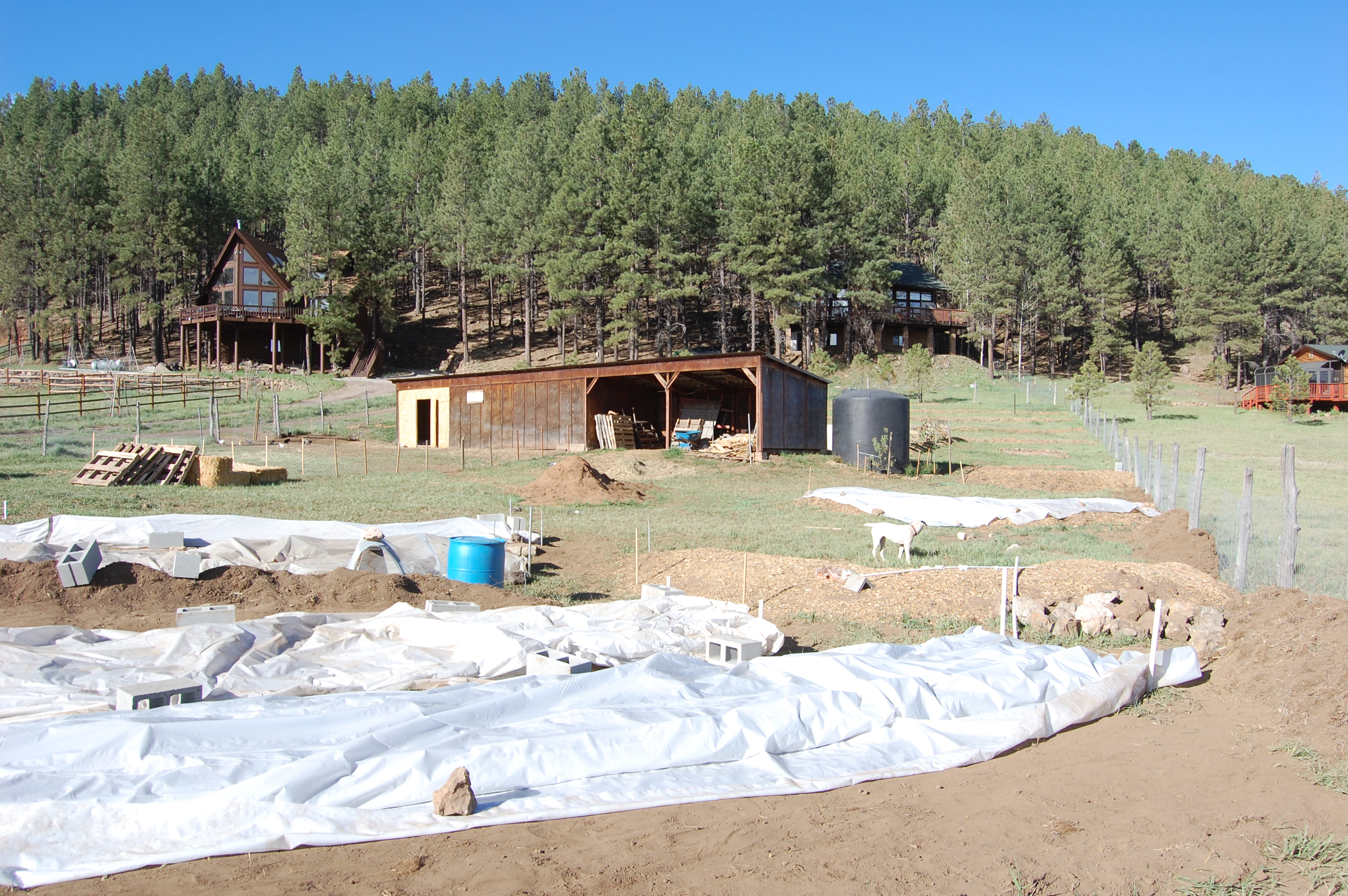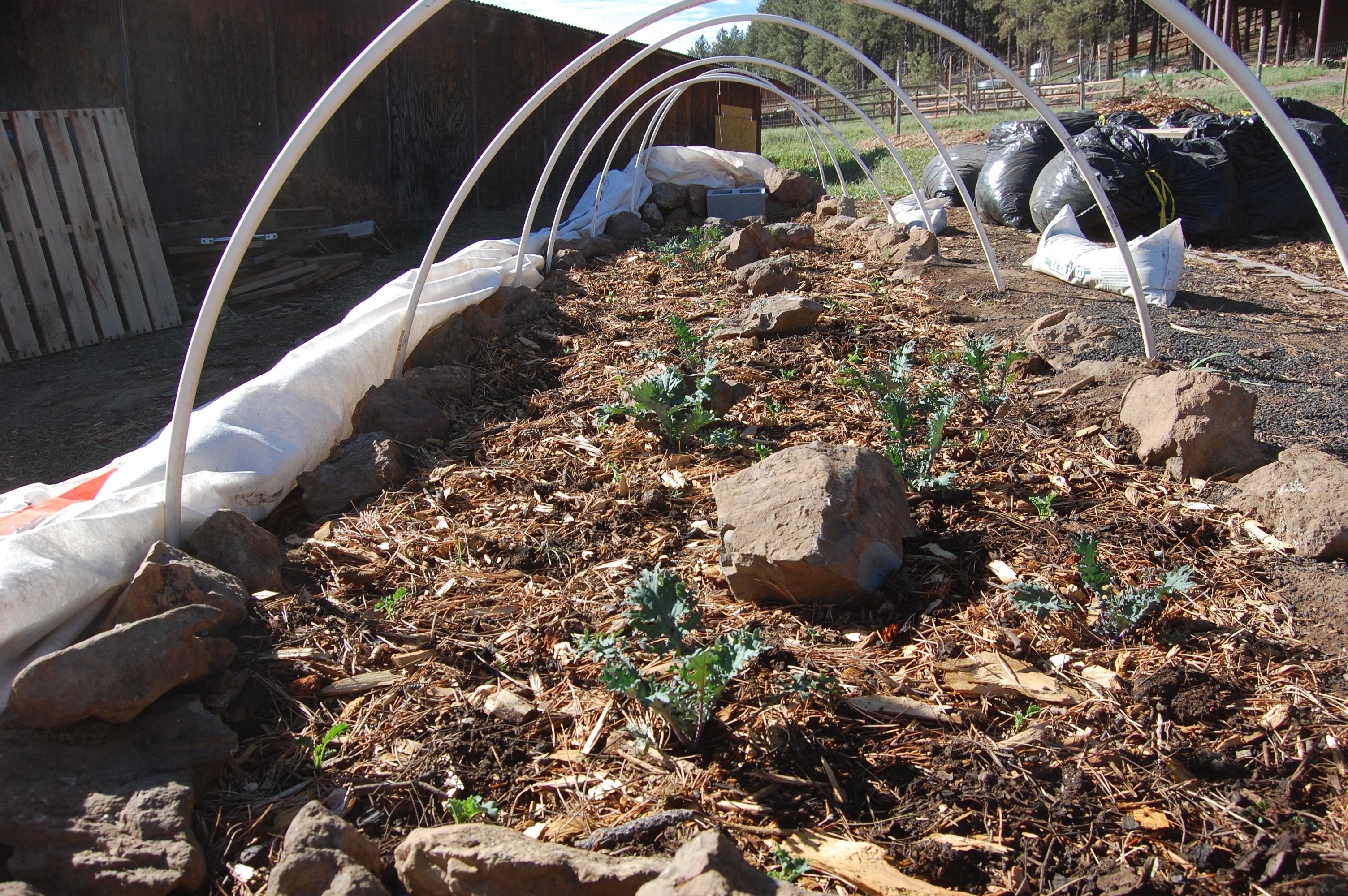 We’re making progress with the raised beds, only one more to go. So far we’ve planted a variety of potatoes, lentils, kale, kale, and more kale, peas, nasturtiums, oregano, basil, thyme, chamomile, bok choy, arugula, chard, a variety of lettuces, radishes, carrots, tons of onions, red, blue, yellow corn, and probably some others. To think the EcoRanch got started in September on the property and in under a year it looks like this: