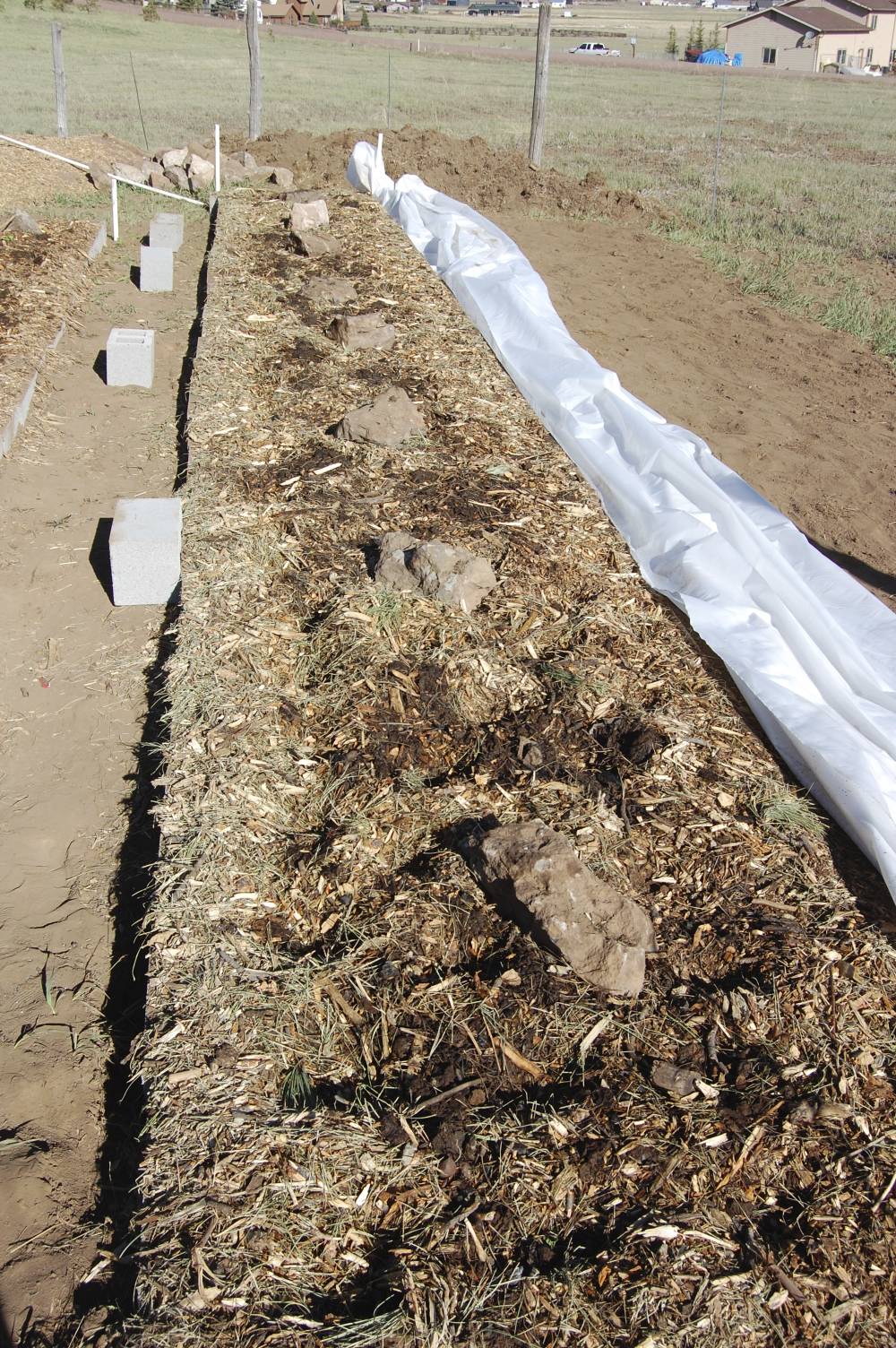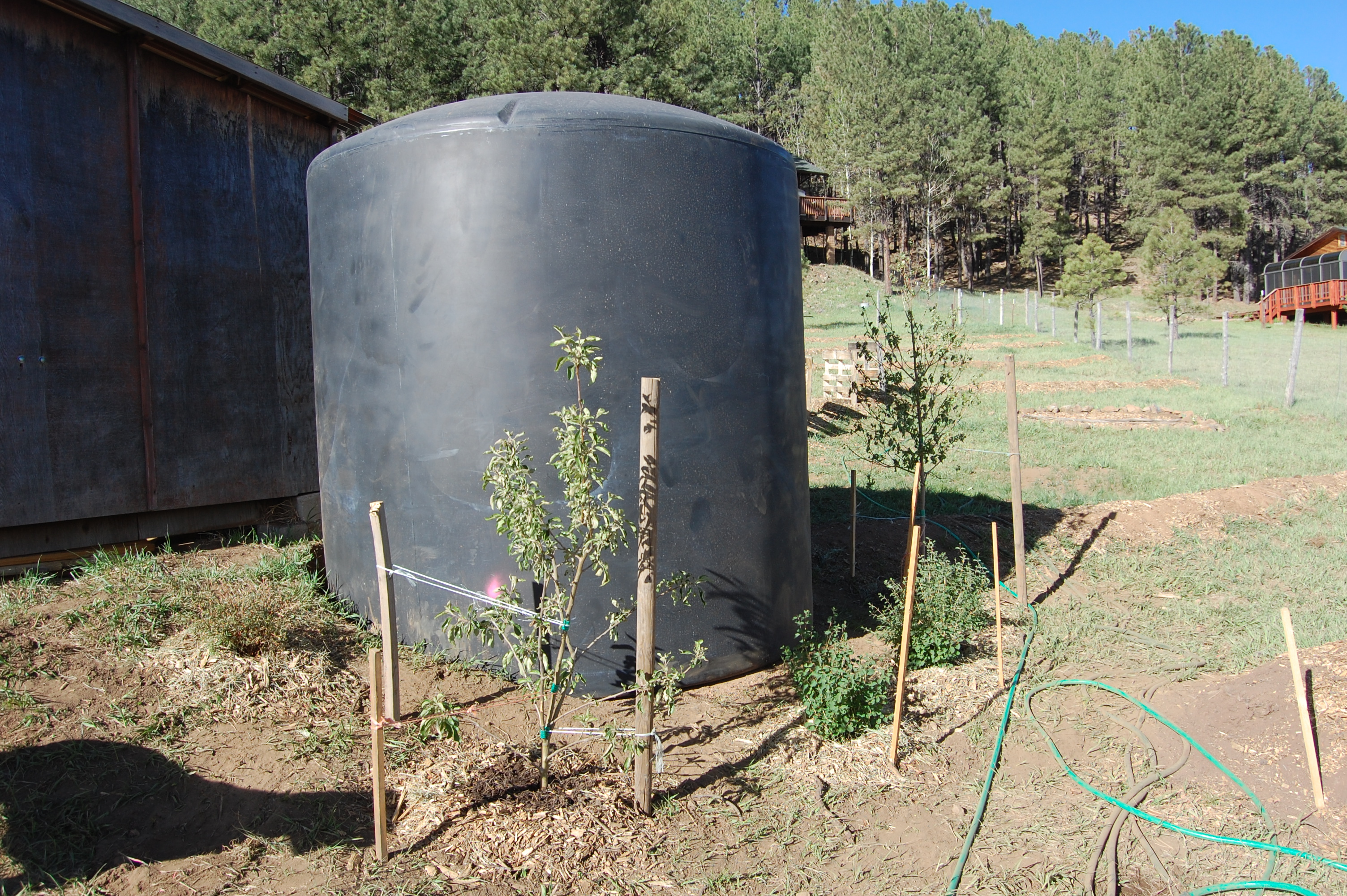 Cedar, a summer intern from NAU in the Env Studies program is working on installing a grey water system from the washing machine that will help irrigate the berms in front which can then be used to plant.