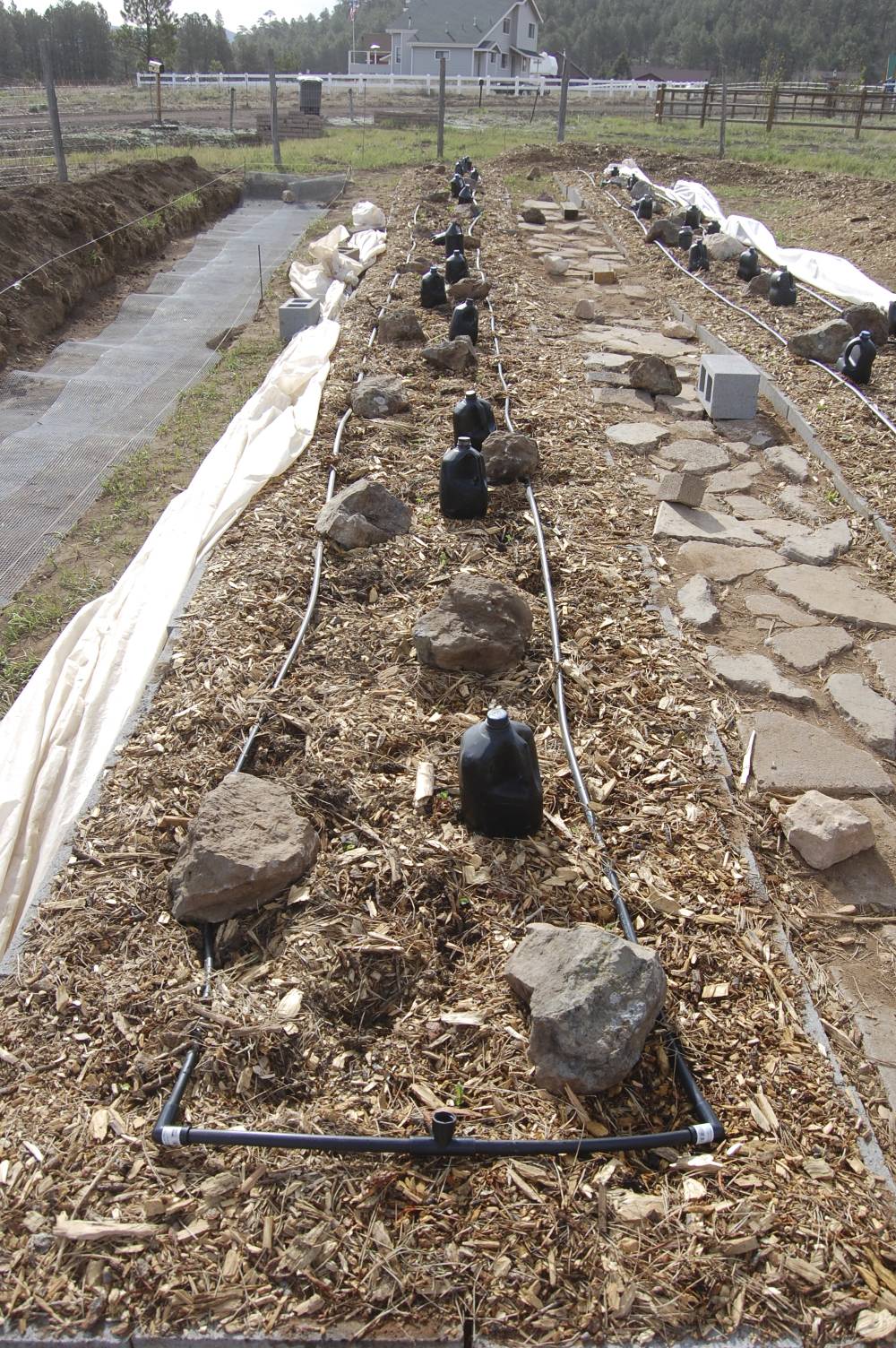 Saving time and water. Beds 1 and 2 are installed with drip lines. Soon they will be buried under the mulch so the water percolates into the soil better. The 3 inches of mulch has been working great to reduce evaporation but it soaks up a lot of water when it is sprayed with a hose. The downside of drip lines; a bit more maintenance, more cost, and the tendency to pay less attention to the plants. The freedom from watering with a hose and using less water definitely have tradeoffs, but in terms of water use, it is totally worth it.