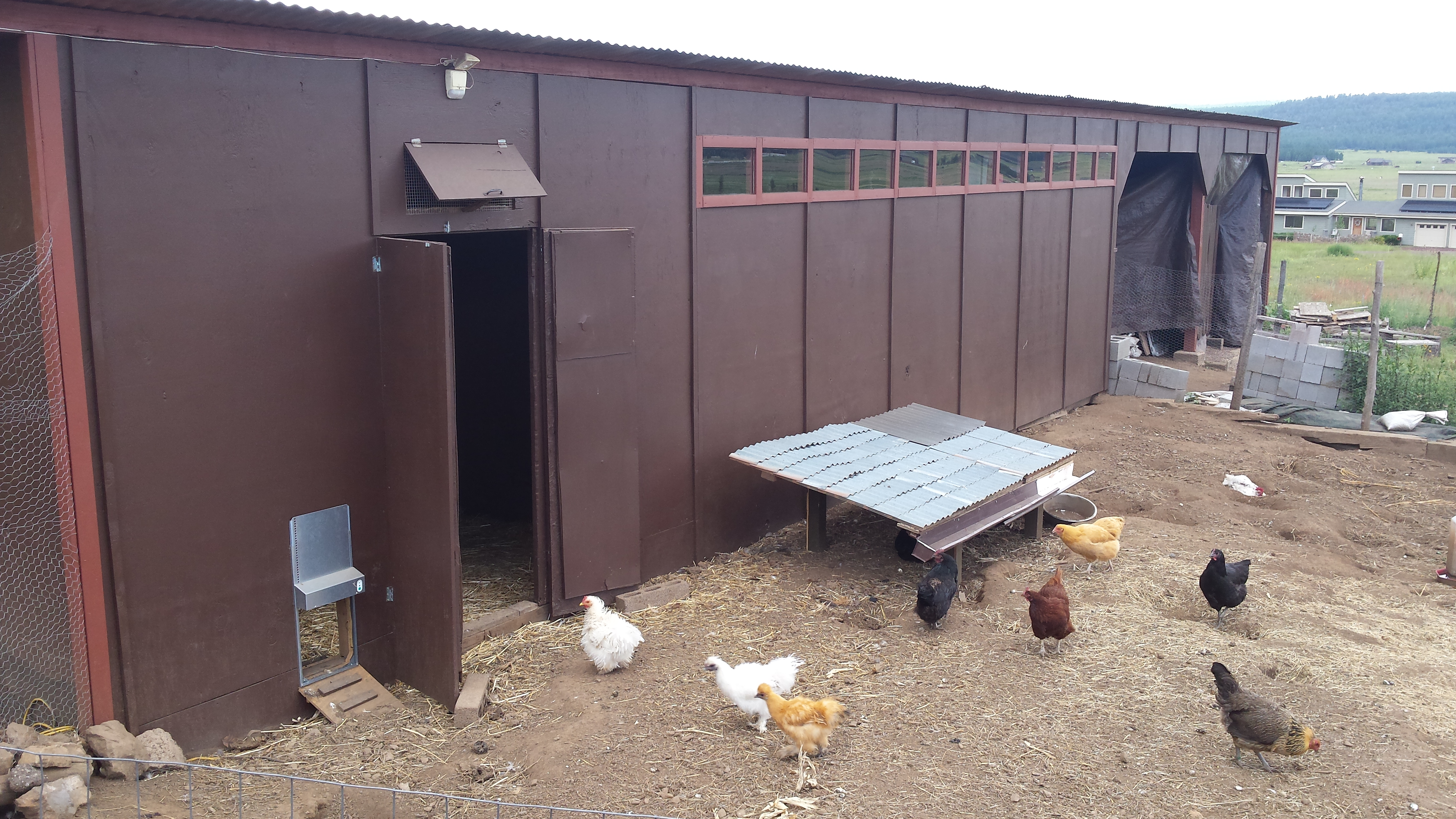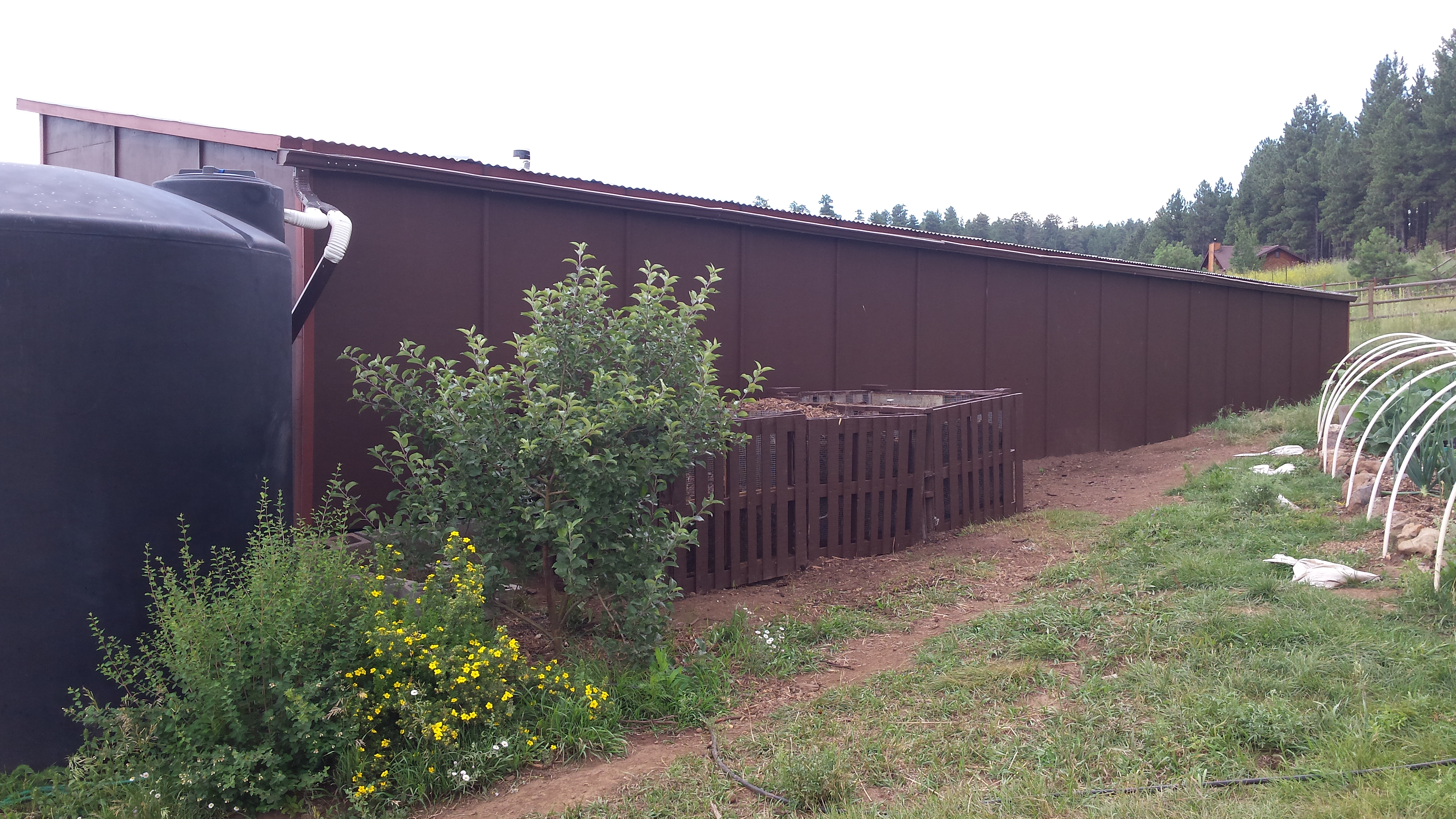 We replaced the rotting, 25 yr old plywood on the sides of the barn (you can see what to old barn looked like), repaired the rainwater catchment system, and then restained the whole thing. We added some windows to reduce our electricity dependency and with some leftover money, were able to put in an automatic chicken door that opens and closes with the solar cycle and automatic chicken feeders.
